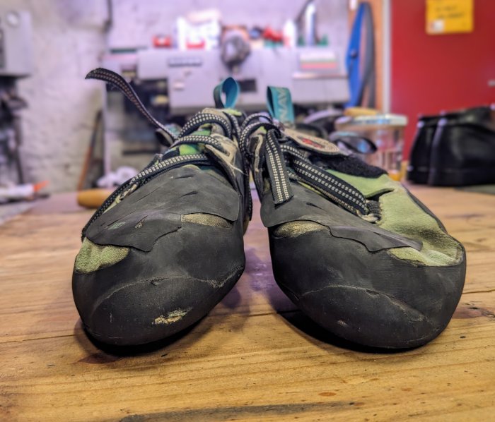 Cette réparation nécessite un changement partiel de l’enrobage du chausson et donc obligatoirement la mise en place d’un nouveau patin afin d’encrer la réparation effectuée sur la pointe.